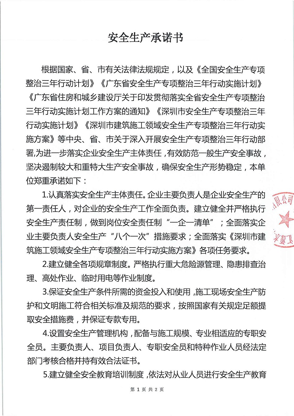 根據(jù)《深圳市住房和建設(shè)局關(guān)于抓緊推進安全生產(chǎn)專項整治三年行動按時完成2020年重點任務(wù)的通知》文件精神,我司立即簽訂《深圳市建筑施工安全生產(chǎn)承諾書》并向社會、員工公開。